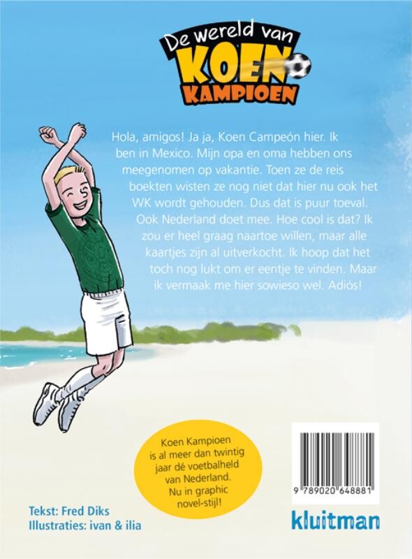 Hola, amigos! Ja ja, Koen Campeón hier. Ik ben in Mexico. Mijn opa en oma hebben ons meegenomen op vakantie. Toen ze de reis boekten wisten ze nog niet dat hier nu ook het WK wordt gehouden. Dus dat is puur toeval. Ook Nederland doet mee. Hoe cool is dat? Ik zou er heel graag naartoe willen, maar alle kaartjes zijn al uitverkocht. Ik hoop dat het toch nog lukt om er eentje te vinden. Maar ik vermaak me hier sowieso wel. Adiós!